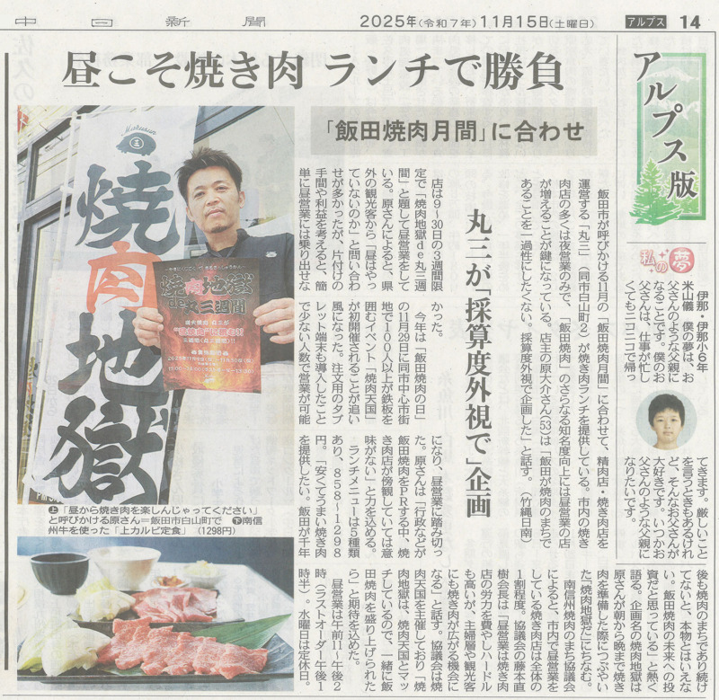 中日新聞に飯田焼肉月間に合わせて現在開催されている限定ランチ企画「焼肉地獄de丸三週間」が掲載されました。